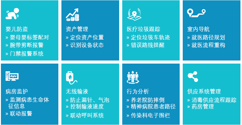 - 醫療應用系統:移動醫療物聯網應用的最終目的是要完成多種醫療應用的任務,最終將數據與EMR、HIS 等醫療業務系統對接。同時,部分應用也需要和醫院其他應用系統配合完成。如嬰兒防盜在未授權標簽越過電子圍欄后,會觸發報警和門禁系統,并借助全院監控系統定位嬰兒位置。