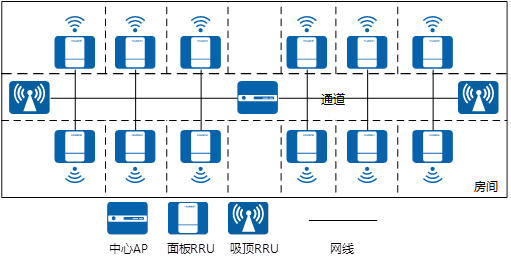 整個方案由中心 AP 和面板RRU、吸頂RRU組成,1 個中心 AP 可以控制最多 24/48 個RRU。中心 AP 負責頻譜分析、漫游切換、負載均衡和關聯控制等功能,遠端模塊 RRU 負責射頻控制、空口管理等功能。該方案的特點: