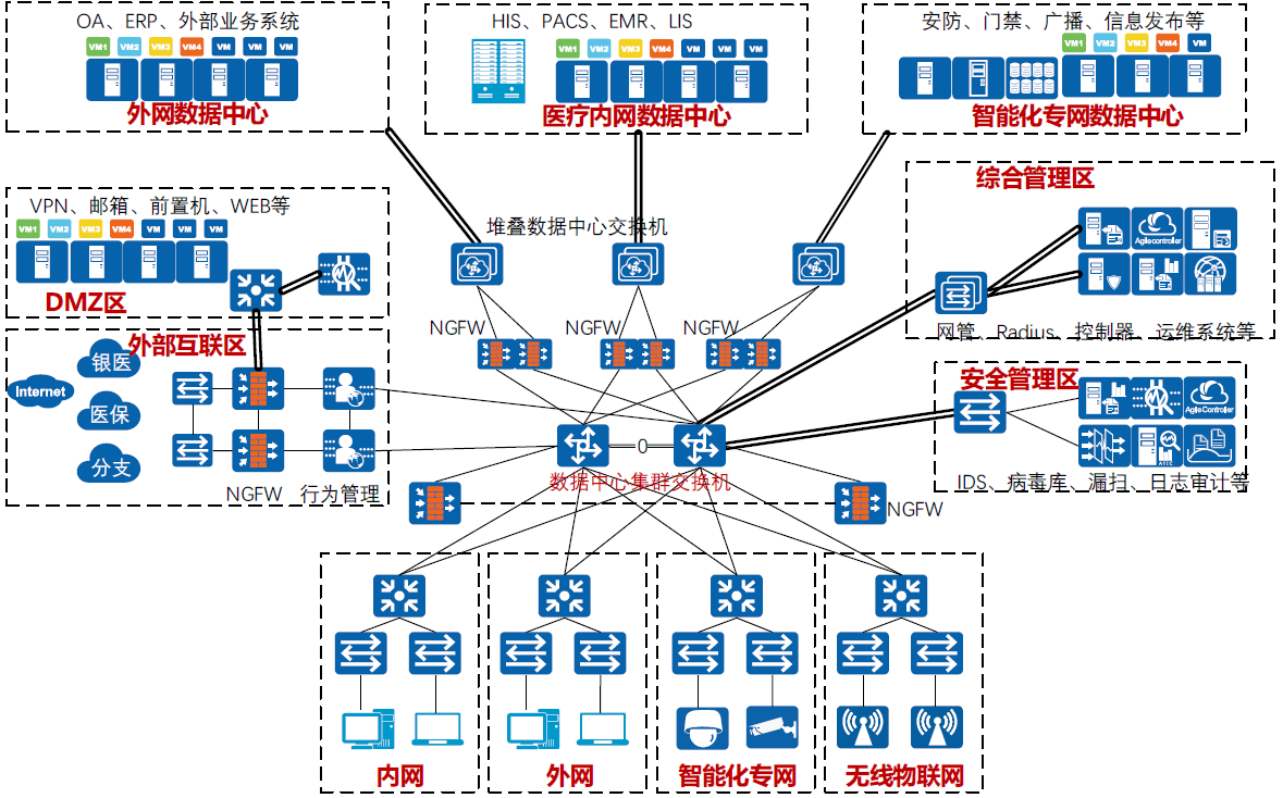 - 安全域:按照醫院數據中心應用系統信息和應用分類的安全需求,數據中心網絡業務內容不同,劃分為內網數據中心、外網數據中心、智能化專網數據中心、DMZ 區、對外互聯區、安全管理區以及綜合管理區 7 個不同的安全域。