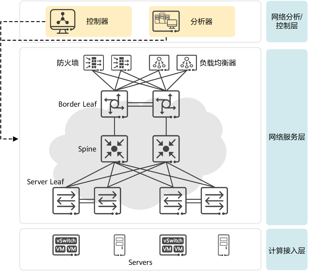 網絡服務層遵循 Spine-Leaf 標準數據中心解決方案架構,由網絡設備如交換機(包括 Server Leaf、Spine、Border Leaf)、防火墻、負載均衡器等組成,采用硬件分布式Overlay 組網方案。