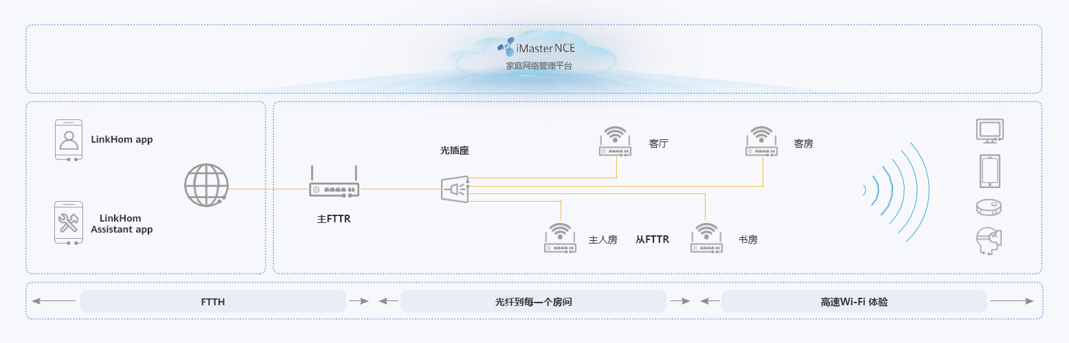 隨著200M及以上寬帶成為主流家庭寬帶,在線教育/視頻/遠(yuǎn)程辦公/電競(jìng)等家庭業(yè)務(wù)需求暴增,家庭用戶對(duì)Wi-Fi質(zhì)量提出了高帶寬,低時(shí)延,廣覆蓋,多用戶的要求。 華為FTTR全光家庭解決方案,通過(guò)將光纖部署到房間,同時(shí)提供多樣的千兆Wi-Fi 6主/從FTTR、全光組件和光纜施工工具,讓家庭用戶在每個(gè)角落、每個(gè)時(shí)刻都能享受穩(wěn)定的千兆Wi-Fi體驗(yàn)。同時(shí),F(xiàn)TTR支持端到端全智能管理,通過(guò)NCE和Linkhome APP,幫助您實(shí)時(shí)掌握全屋網(wǎng)絡(luò)狀態(tài),另外提供家長(zhǎng)控制等功能,保障兒童綠色安全上網(wǎng)。